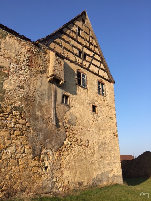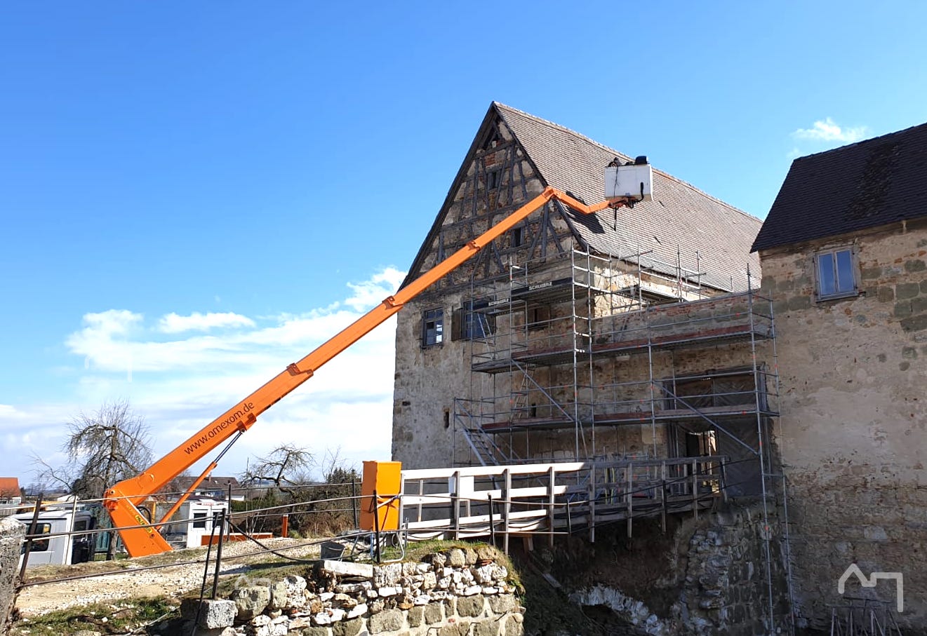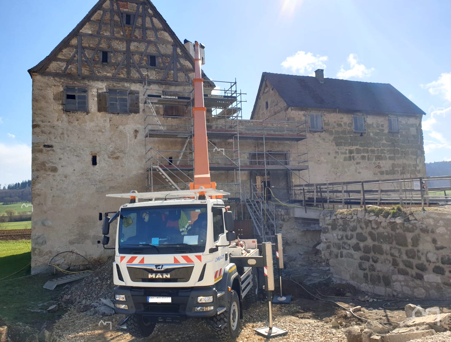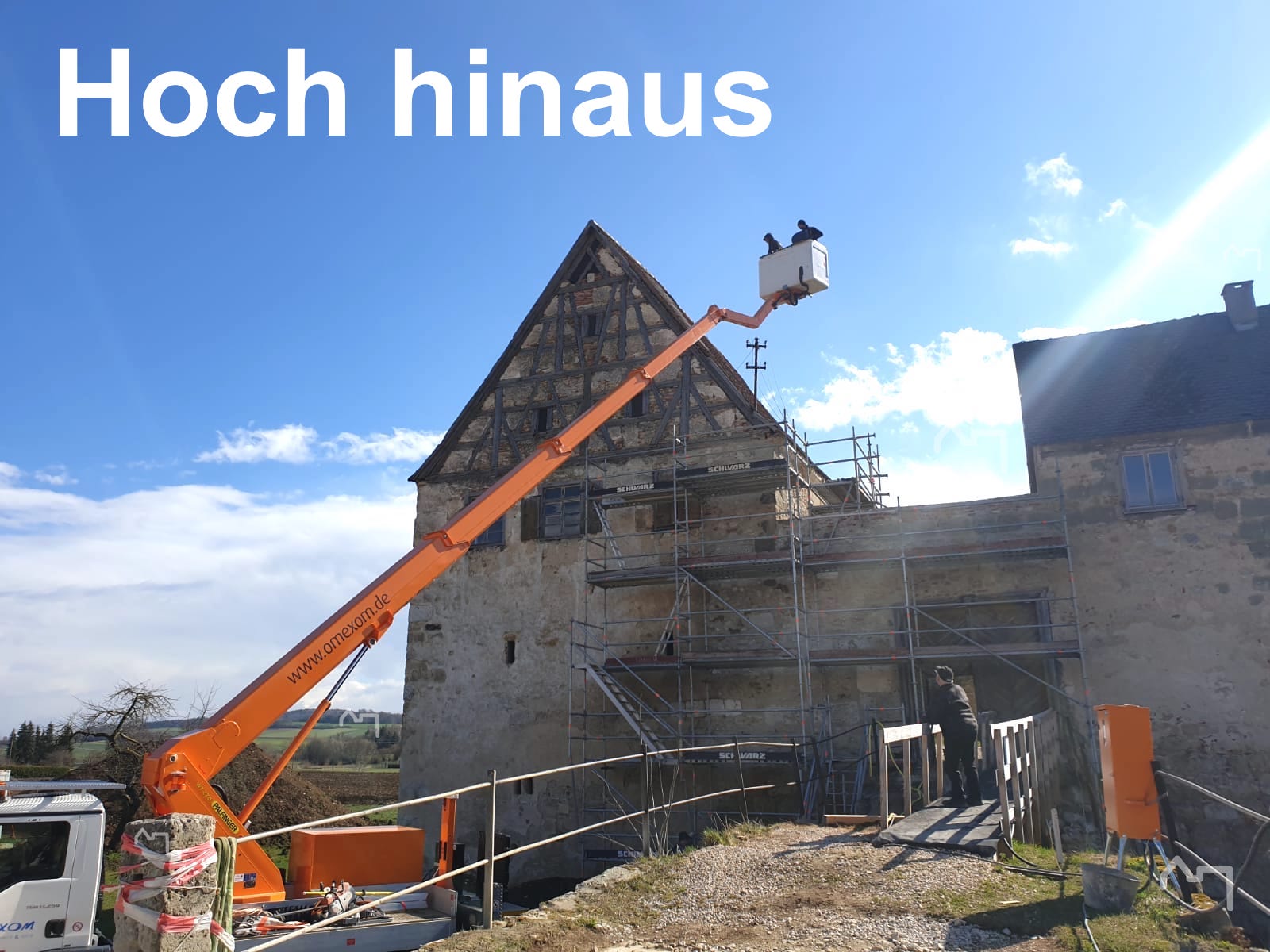 KW 11/ Mitte März 2019: Jetzt wird dem Schlossgeist aufs Dach gestiegen! Aber erstmal gehts hoch hinaus. Zur Sicherung des Eingangsbereichs muss auch die alte Stromleitung in Augenschein genommen werden. Und ehrlich gesagt, so eon Strommast passt ja auch nun mal nicht auf ein historisches Gebäude. Aber man muss erst einmal hinkommen! Also, her mit dem Kranwagen…