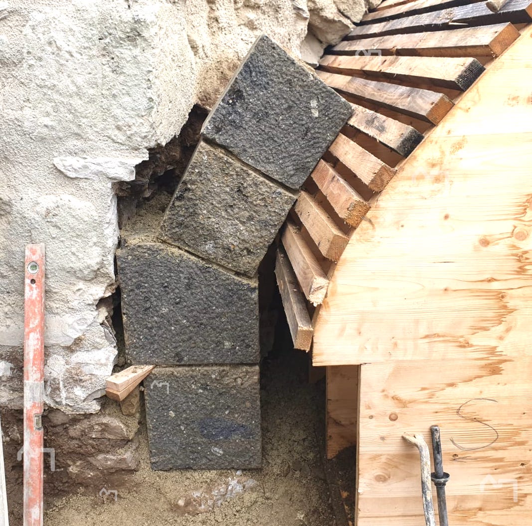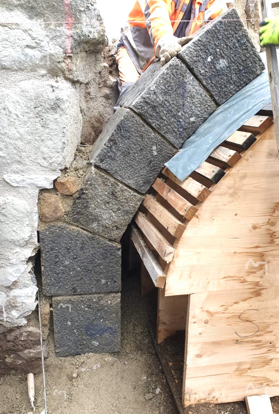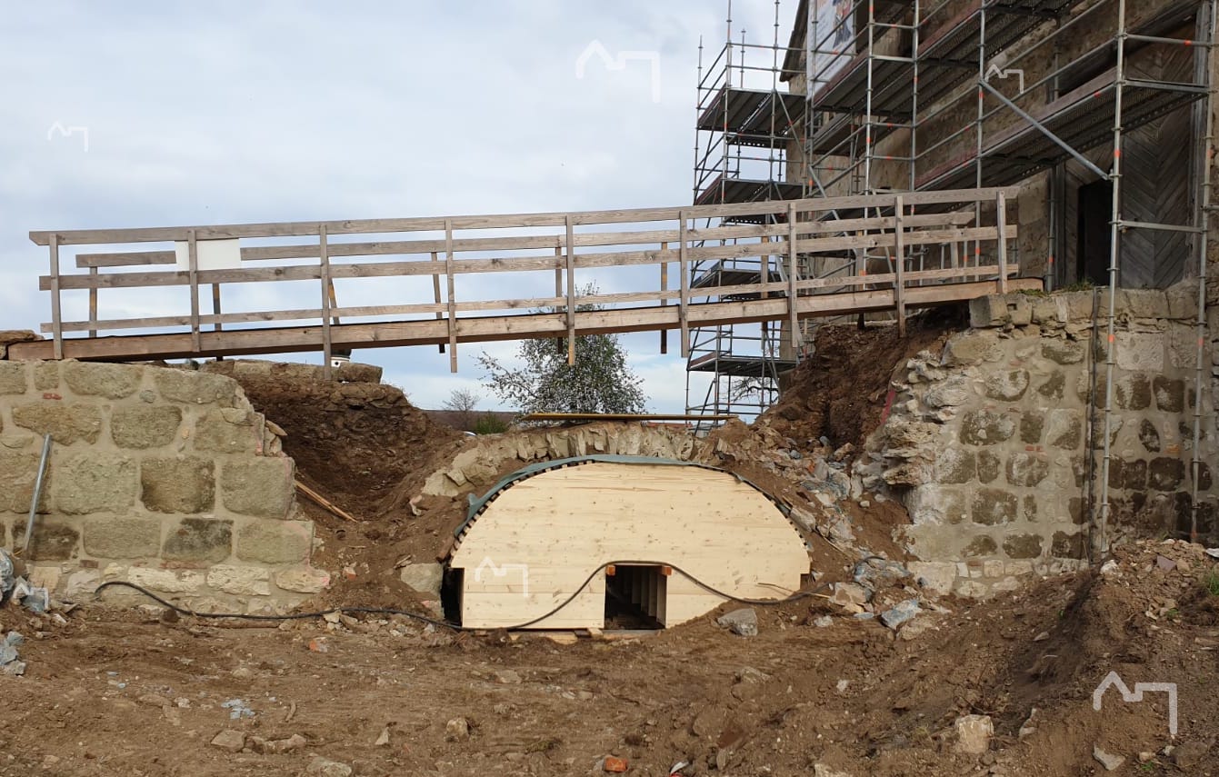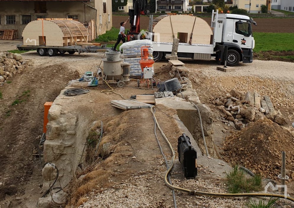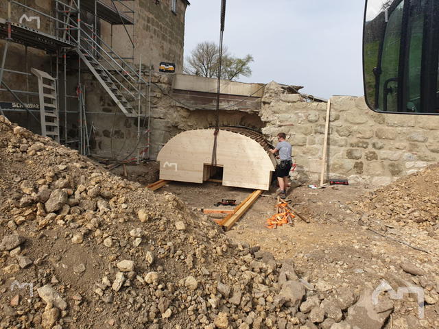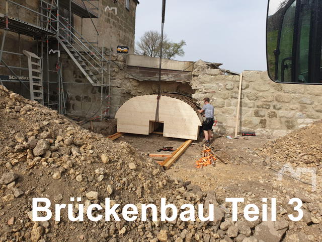 Jetzt geht es darum, alles – und insbesondere den gemauerten Brückenbogen – wieder herzustellen. Damit das geht kommt erstmal ein Hilfsgerüst her: