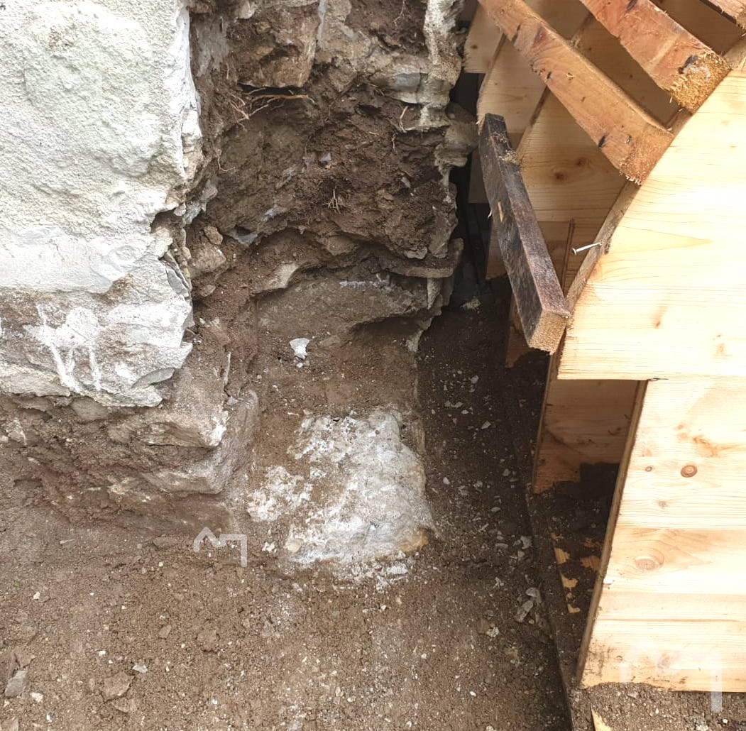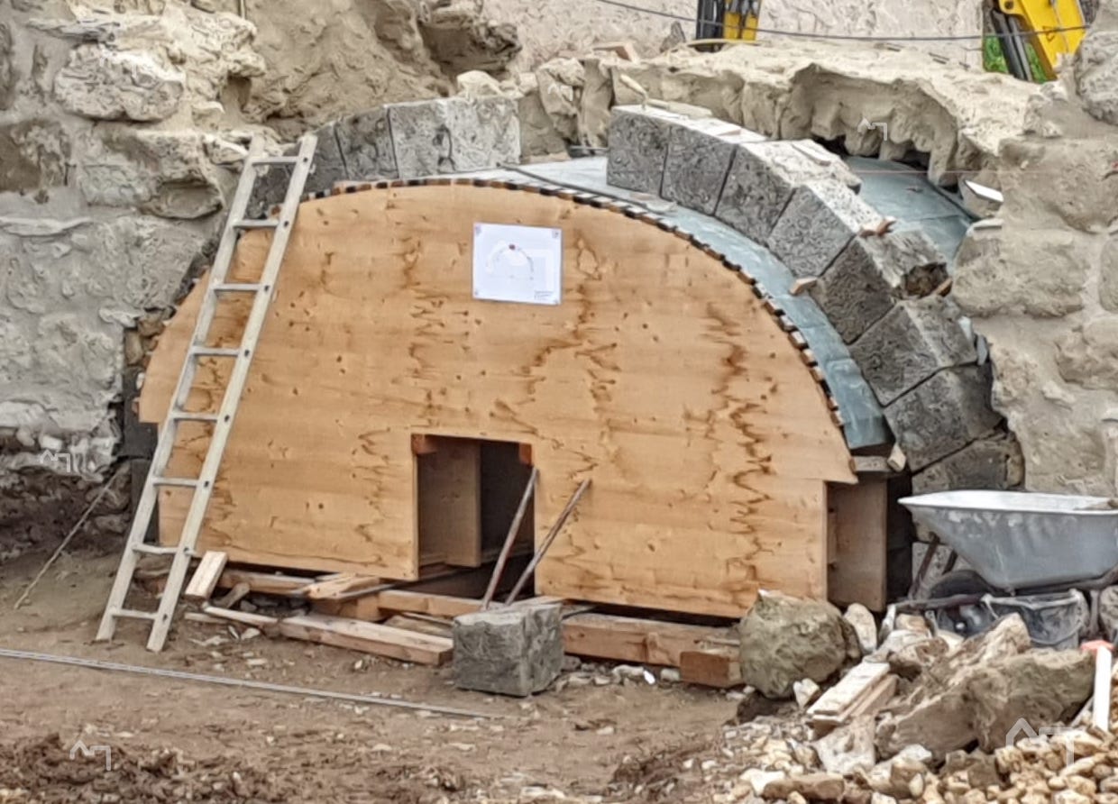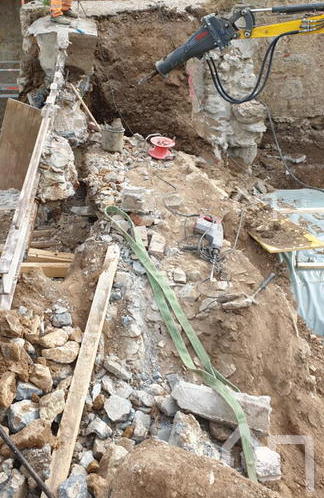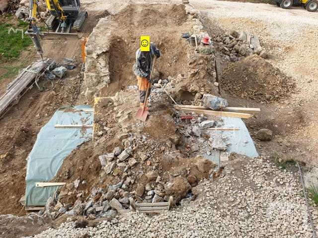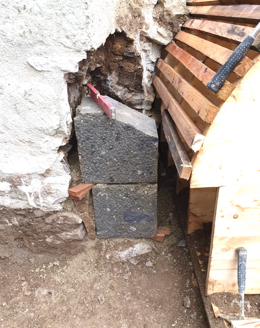 Jetzt geht es darum, alles – und insbesondere den gemauerten Brückenbogen – wieder herzustellen. Damit das geht kommt erstmal ein Hilfsgerüst her: