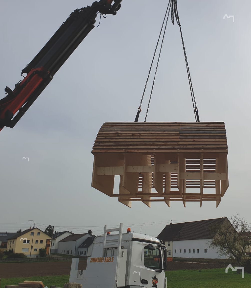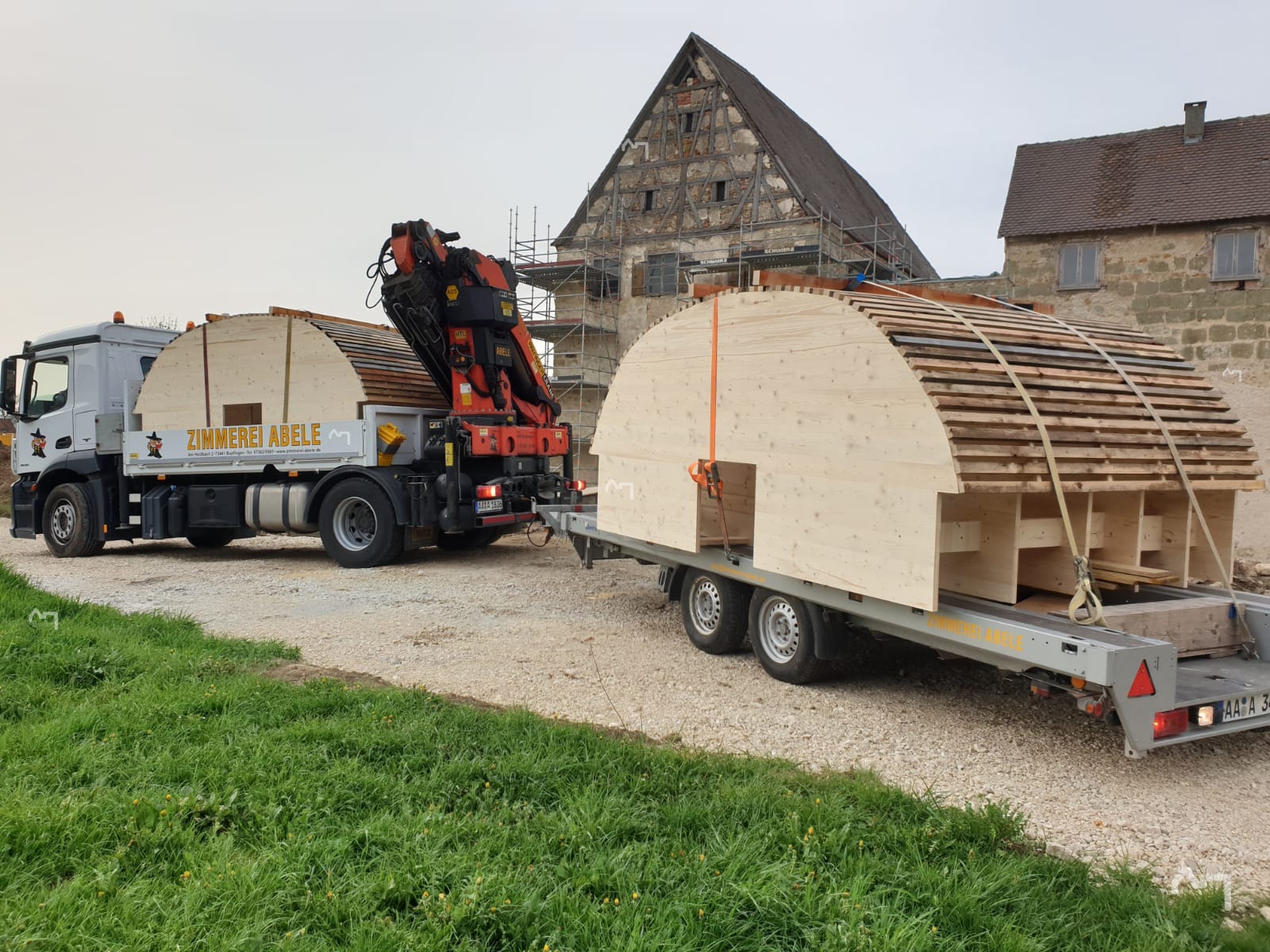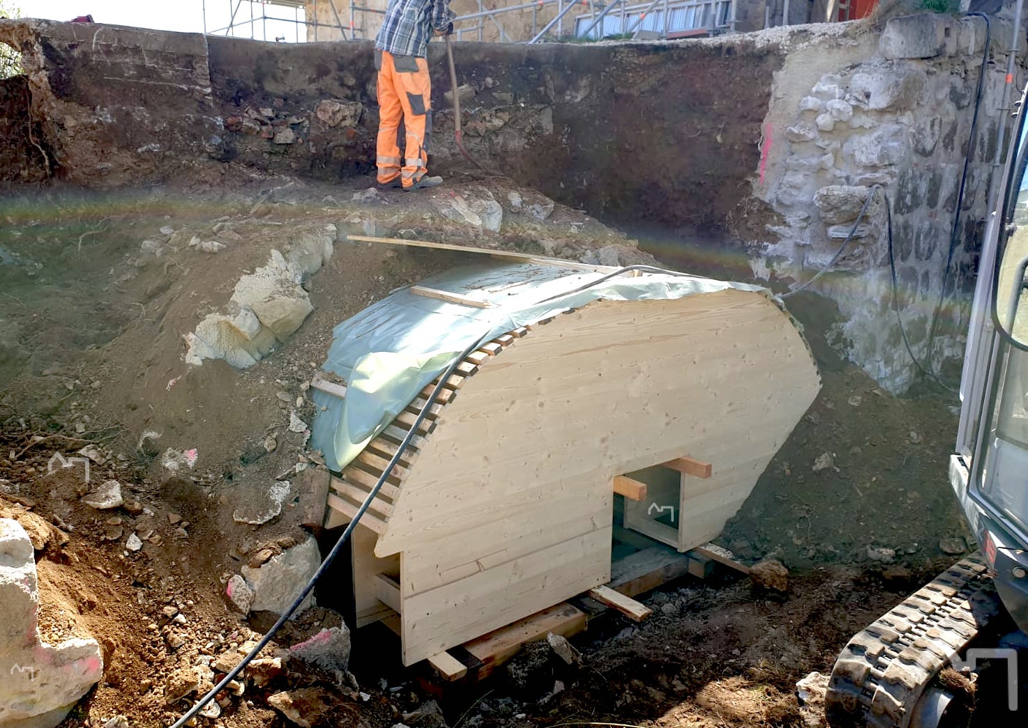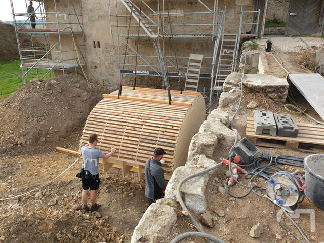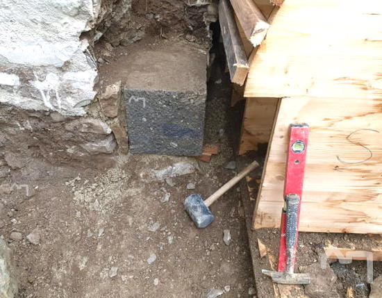 Jetzt geht es darum, alles – und insbesondere den gemauerten Brückenbogen – wieder herzustellen. Damit das geht kommt erstmal ein Hilfsgerüst her: