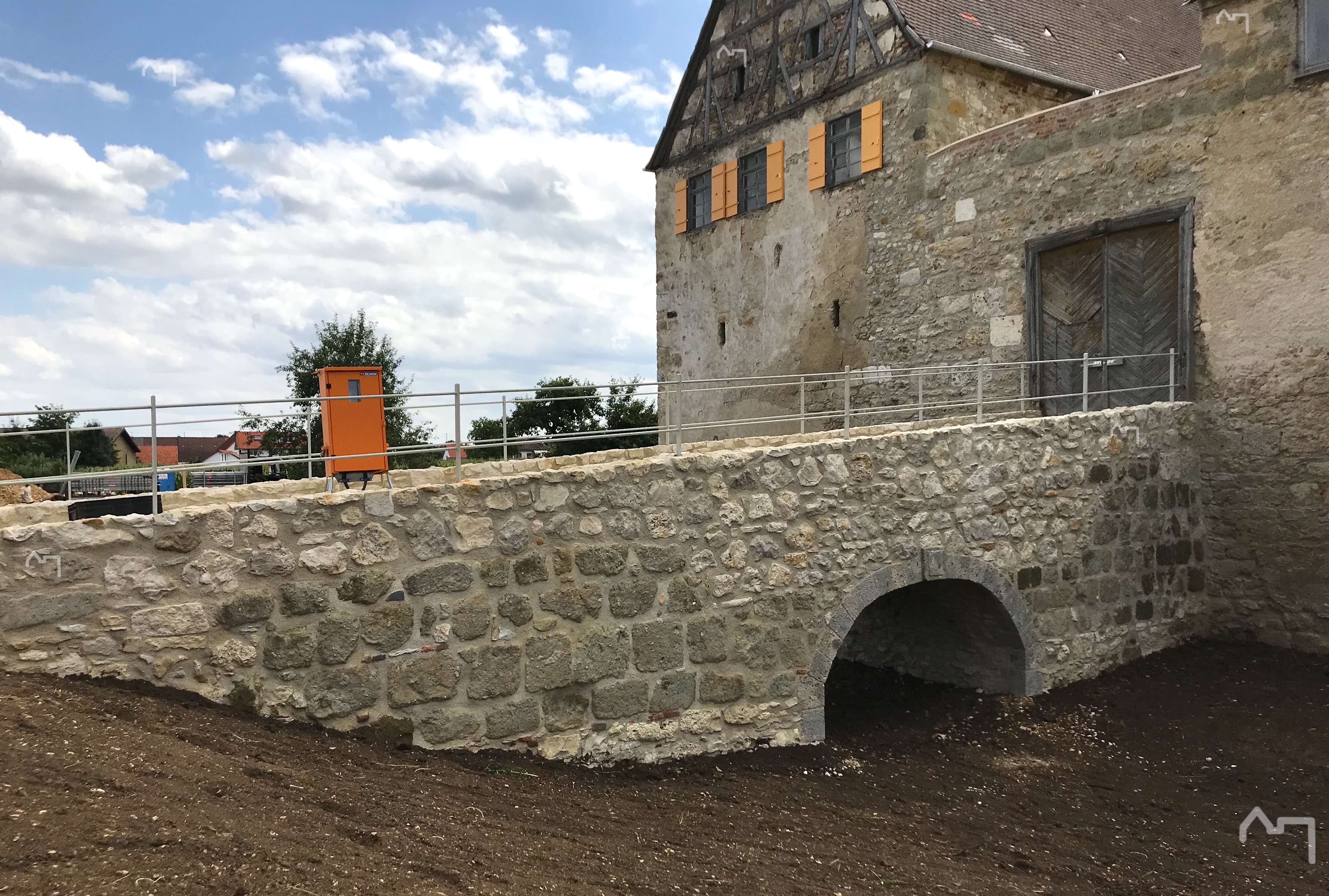 Die Brücke ist jetzt soweit mit Geländer vorbereitet und begehbar. Schlossherr und sein Gefolge können jetzt sicher zum Wasserschloss schreiten!