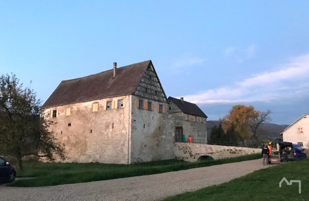 Vor kurzem noch großer Trubel mit Zelt , Musik, Besichtigungen, Besuchern und jetzt liegt das Schlössle offensichtlich wieder ruhig da. Deutlich hübscher als im letzten Herbst. Ruhig in der deutlich schwächeren Herbstsonne hebt sich das Schloss von der diesigen Waldlandschaft im Hintergrund ab. Die Vögel zwitschern…. ääääh… Moment mal… da ist doch noch soviel zu tun, oder?