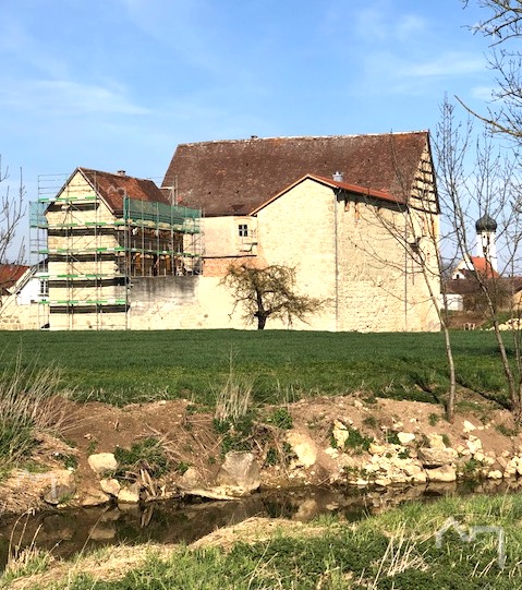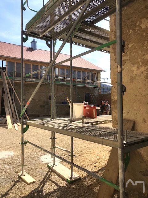 Also näher ran und dann sieht man es schon. Wieder mal ein Gerüst. Jetzt am Torhaus. Alles zur Vorbereitung der Dachsanierung, die ansteht.