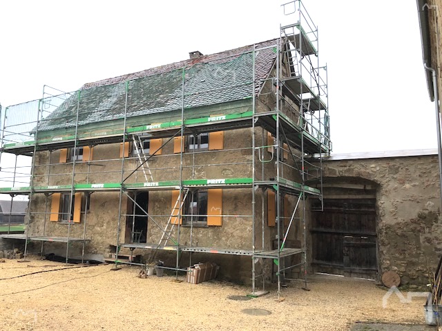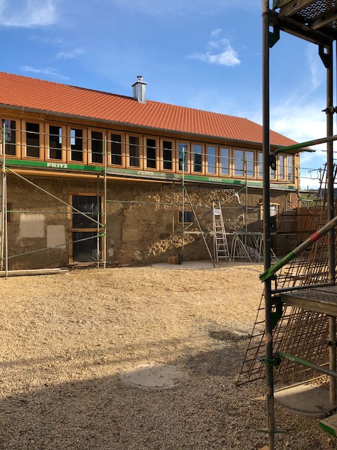 Vom Innenhof her sieht man die Einrüstung bis zum Dach komplett. Kein Wunder, wenn es da klappert.
