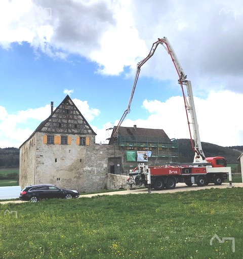 Und dann kommt auch schon die Betonpumpe. Hauptsache der ganze Innenhof wird nicht ausgegossen 😉 .