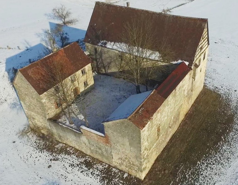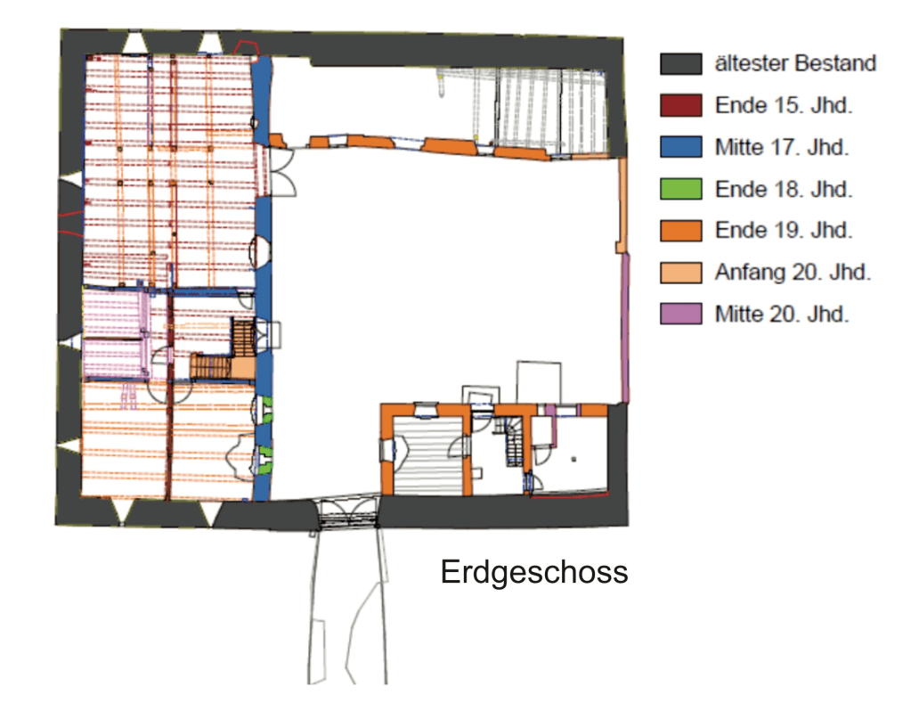 Das Erdgeschoss des Schlosses war ursprünglich zweischiffig mit einem Mittelunterzug und 6 bis 7 Zonen (noch sichtbar durch die Verkämmung mit Blattsitzen für Kopfbänder an den Decken-balken von 1489/90). Auf der Ostseite waren die Ständer innen vor die Außenwand gestellt, auf der Westseite sind die Zapfenlöcher für die Ständer teilweise in der jetzt massiven Wand zum Hof ablesbar. Die Treppe im Obergeschoss wurde nachträglich eingebaut. Die Fenster zur Hofseite wurden verkleinert und mit einer kleinen runden Öffnung versehen. Südlich im Stall befindet sich eine zugesetzte Fensteröffnung. Die Wand an der Innenhofseite besitzt keine Verzahnung mit der äußeren Wehrmauer.