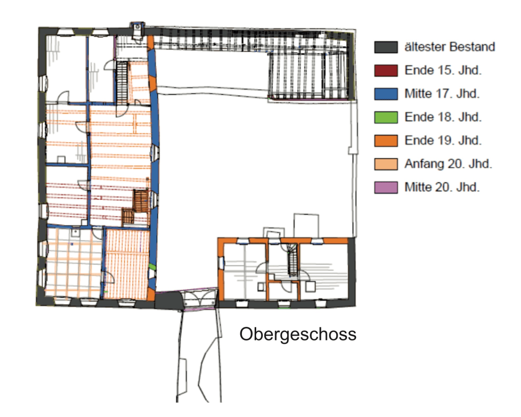 Die Raumgliederung des Obergeschosses stammt weitest-gehend aus dem Jahr 1641/42. Die Reste der Zeit 1489/90 deuten aber auf eine ähnliche Gliederung wie im Erdgeschoss hin. Die Wand zum Innenhof hin war 1489/90 ebenfalls eine Fachwerkwand. An den Anschlüssen zur äußeren Wehrmauer befinden sich sowohl nördlich als auch südlich zugesetzte Türen mit einem Segmentbogen, die auf eine wehrgangähnliche Situation hinweisen. Die Fenster zum Hof wurden ebenfalls verkleinert. Ursprünglich hatten alle Fenster des Obergeschosses eine Größe. Südlich befindet sich an der Wand zur Hofseite hin eine zugesetzte Türöffnung mit Segmentbogen, in die ein Stein mit Jahreszahl und Namenszug (1553 – christoff v. d. stain) eingesetzt wurde.